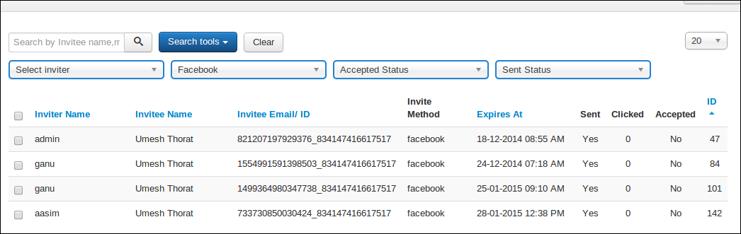 Invitee's stats report in back end,detailed stats report of the invitations sent. The report contains information about Inviter name, invitee name, invitee email id, method of invitation and much more.