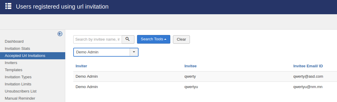 Site administrators are now enabled to view a list of the invitation statistics regarding the invitees that are successfully registered using the "Invite via URL invitation method". An option to filter the different inviters for the different invitees is also provided along with this feature.