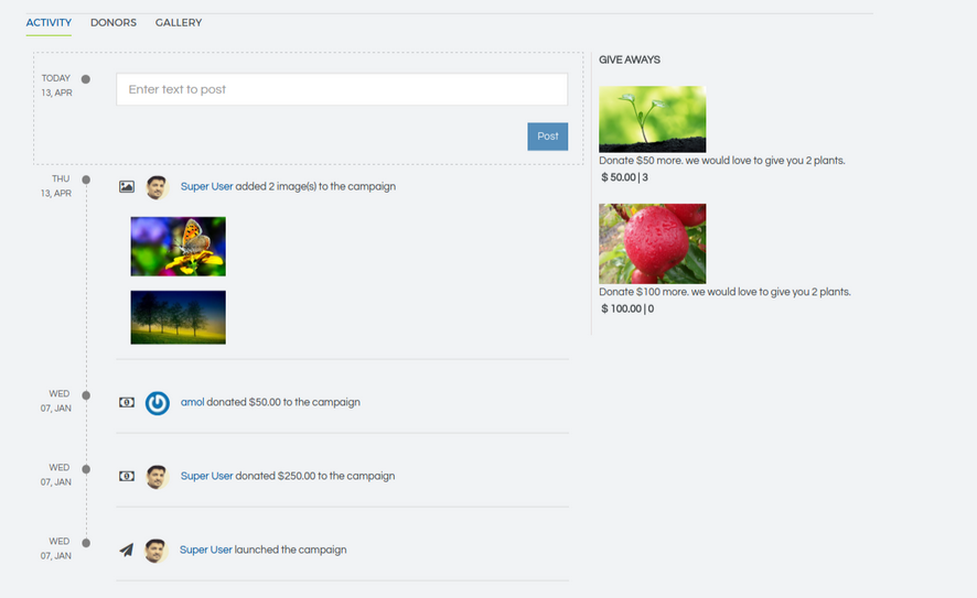 The brand new activity stream system (coming soon to other Techjoomla products too!) creates an aggregated stream of all activities happening around the campaign. This includes posted Photos, Videos, Donations and Investments as well as a quick way for campaign owners to post updates about their campaign !