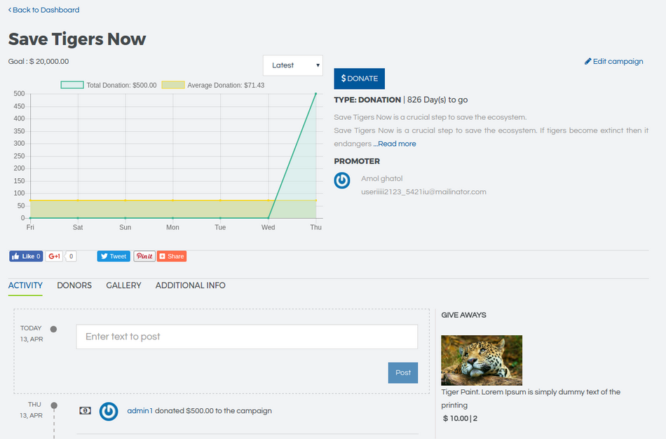 If you are the owner of the campaign, the page transforms automagically to give you a comprehensive campaign working area from where you can see a high level overview of the campaign , update campaign activities as well as edit your campaign information & post photos & videos.
