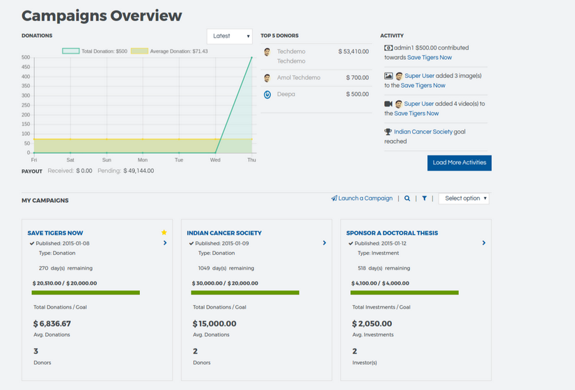 We introduce a brand new Campaign Dashboard view that gives the campaign owner a detailed view of how his campaigns are performing. Widgets also show your top donors as well as latest activities on your campaigns and status of payouts.
