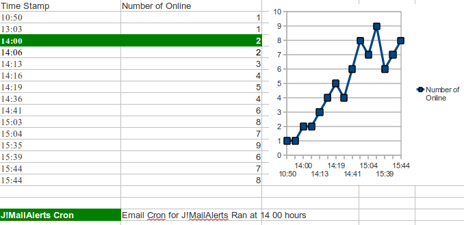 Our J!MailAlerts Cron has been set to run at 14 00 hours everyday & Alerts are set to Daily . We have recently changed this so that everyone gets an email in their Inbox when they get back from Lunch. Here's a statistics chart of how the user's online have increased after the email alert has gone out ..