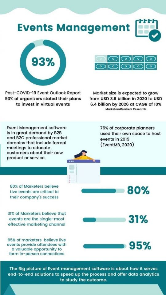 As COVID-19 has created the demand for virtual events, the Post Covid-19 Event Outlook report recorded that 93% of organizers are interested in investing in virtual events. It demonstrates that event management is now supposedly reaching a new dimension of success and will become a part of hybrid events in the future.