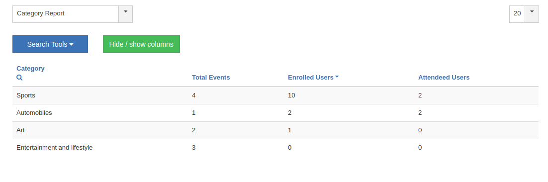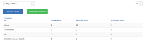 This report displays the number of events under each category along with total enrolled users and attended users.