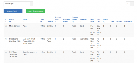 Event report highlight the popularity of the events considering the number of enrolled users, attended users, likes and dislikes for the events.