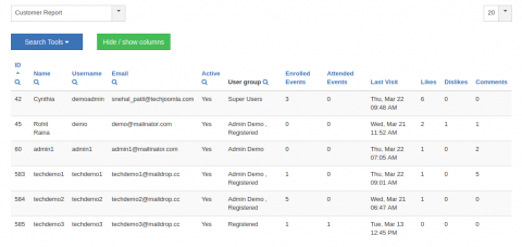 Customer report displays the customer data for the number of enrolled events, attended events along with the number of likes.