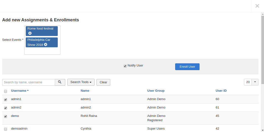 From this version, we have introduced a new view which is accessible to Site admins on the backend and for Vendors & Managers (via com_hierarchy integration) on the frontend. This allows Admins, Vendors & Managers to manually enroll other users to Events.