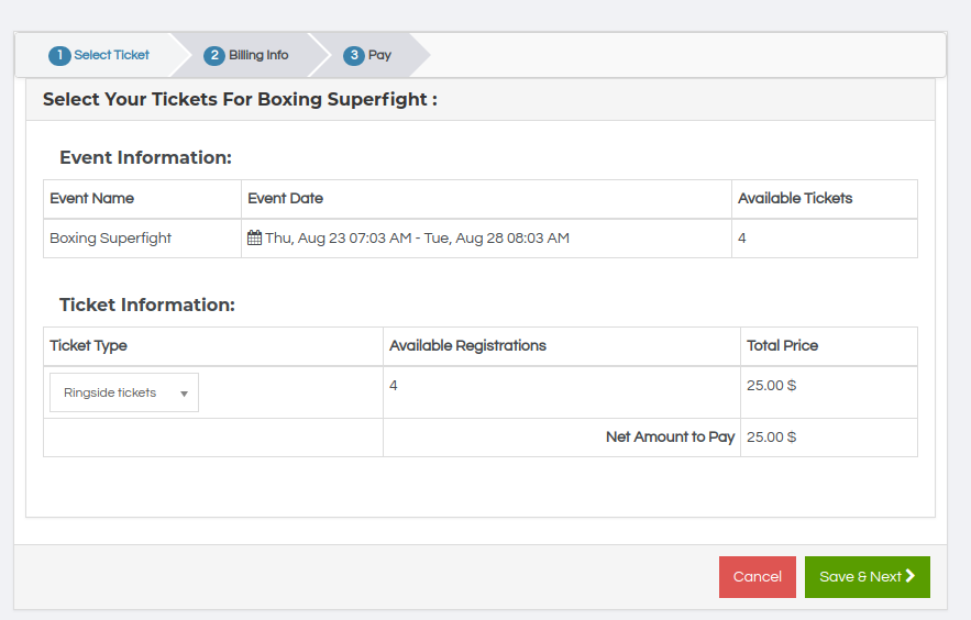 This feature allows you to restrict the number of seats to 1 ticket per user. This feature is vital for classroom training as user needs a simplified checkout flow to register for the event. After purchasing the ticket, the user will be able to view his ticket on the event details page. Event attendees can get a clear idea of the total number of available registrations for the event before proceeding with the checkout. Note that this feature won’t apply to guest users who buy tickets.
