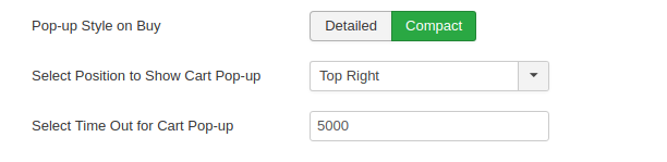 We have introduced toast message for products added to the cart in this version. This feature is an improvement over the earlier bootstrap popover. A toast message will be displayed when a product is added to the cart. The message will also display the number of products that have been added to the cart along with an option to either go to the checkout process and complete the payment or continue shopping for your favourite products. Also, the position of the toast message is configurable in the extension with the compact view. One can also Select Time Out for Cart Pop-up.