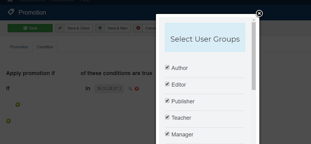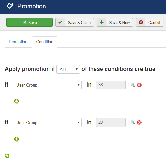 - #161014 Ability to create promotions specific to Joomla User Groups.