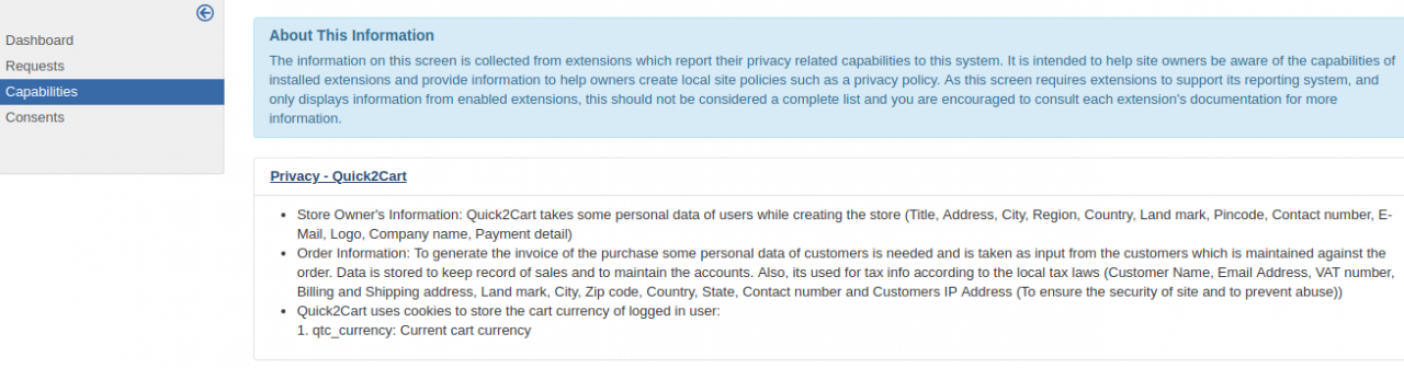 - This plugin will help site admins drafting their privacy policy by showing in the admin area what all user data Quick2Cart collects