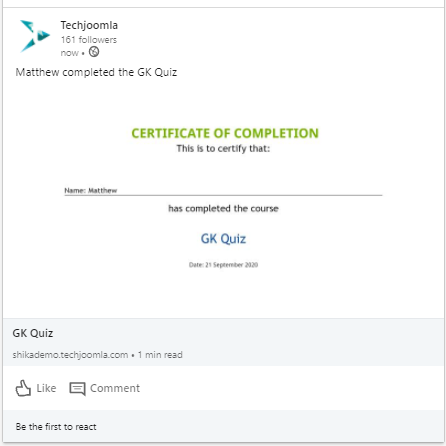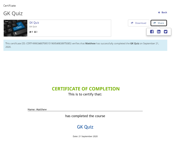 The public certificate page also has a widget to show the course information which is a great way to promote your course to your student’s networks!