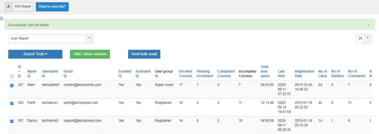 Site administrators can update multiple users at once with the bulk email option from the user report. This feature was possible due to the new release of our infrastructure extension TJ Reports.