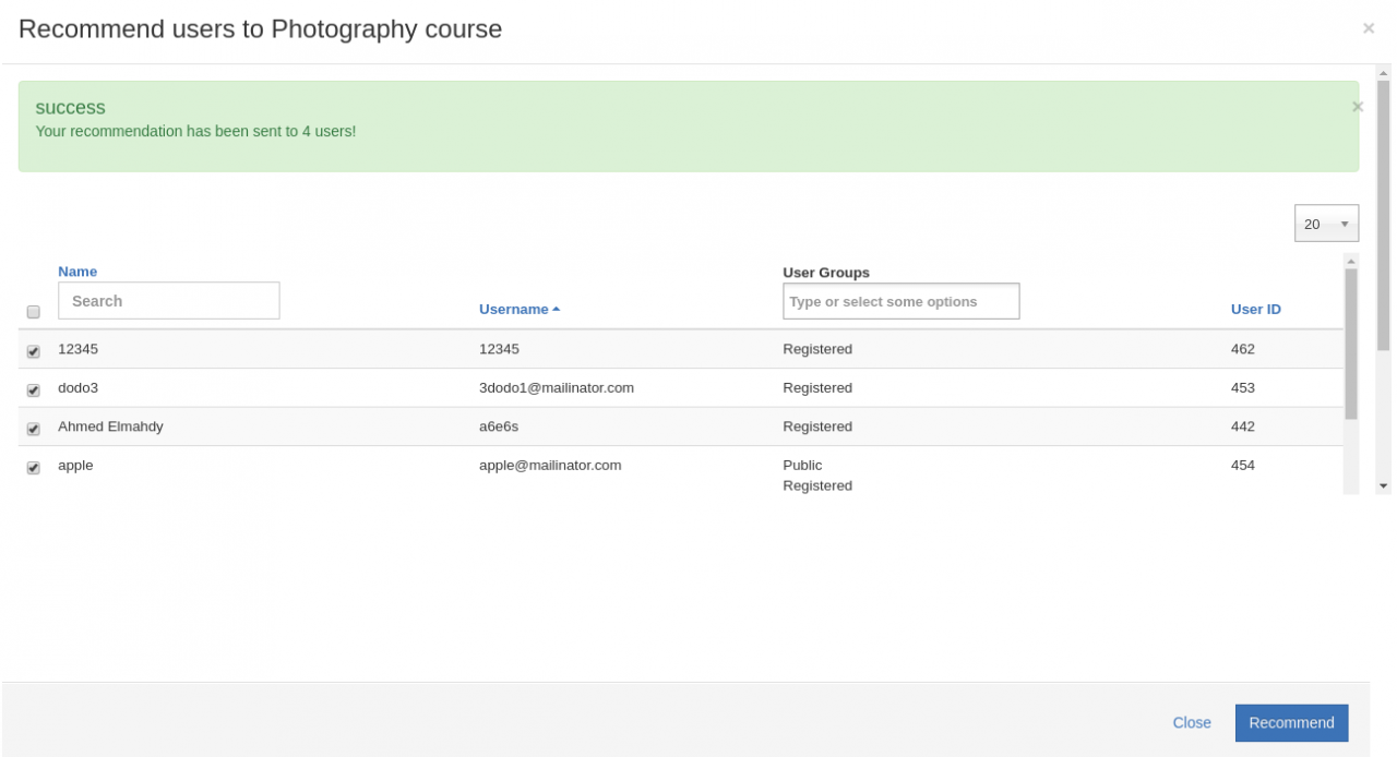 Course recommendations can be given by any of the users registered on the system to their friends or any user on the Joomla website. Depending on whether you are using plain Joomla or a Social networking extension, this allows recommending courses to anyone of the website or just your Friends. Recommended courses are a great way to drive learning in a Social manner.