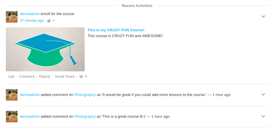 Though Shika has its own activity stream, however, if you are integrating a Social network of your own, then we support pushing activities into the supported Social Stream of the user. This adds massive value to learning in the network by promoting content discovery and peer interaction on gaining knowledge and unlocking new achievements. Following screenshot highlights Shika’s integration with EasySocial activity stream.