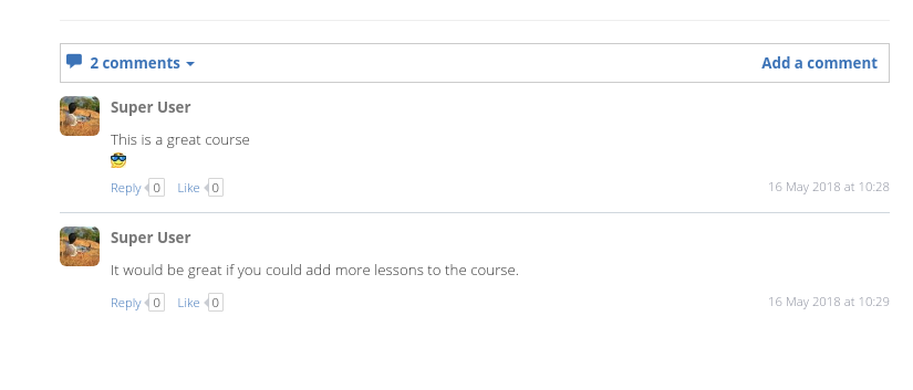 Comments allow users to express their opinions about various aspects of the course. It could be feedback to the course author or general reviews by users/students to share their experiences on the course. Commenting is threaded as well as open to the public. Course likes and comments are offered via jLike. It can also be used as a course specific Q&A area by the student and the teachers.