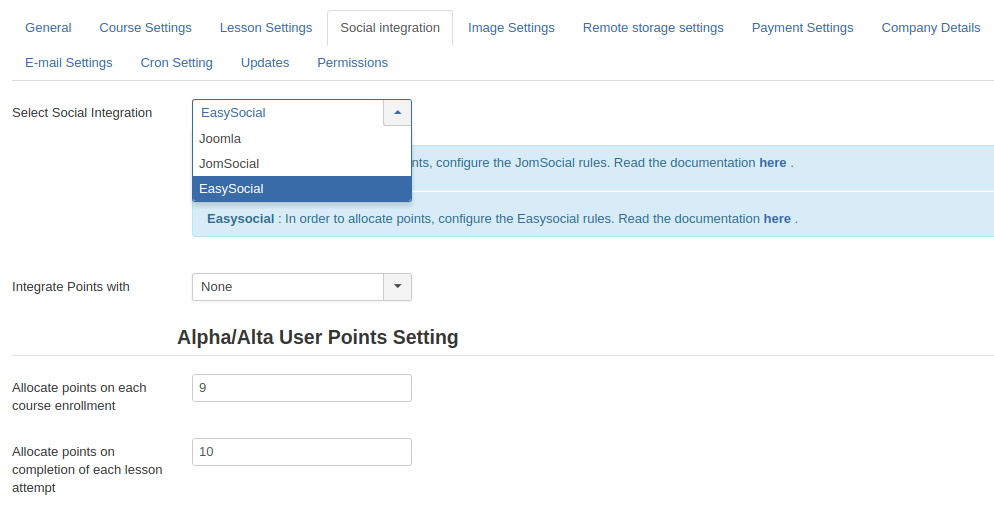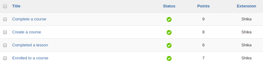 Rewards are an excellent way to promote e-learning. Points integration will let you do this quite easily. Shika supports integration with JomSocial as well as EasySocial points systems. With Shika 1.1.12, we have provided feature support for AltaUserPoints. Users will be allocated points based on each course enrollment and on completion of each lesson attempt.