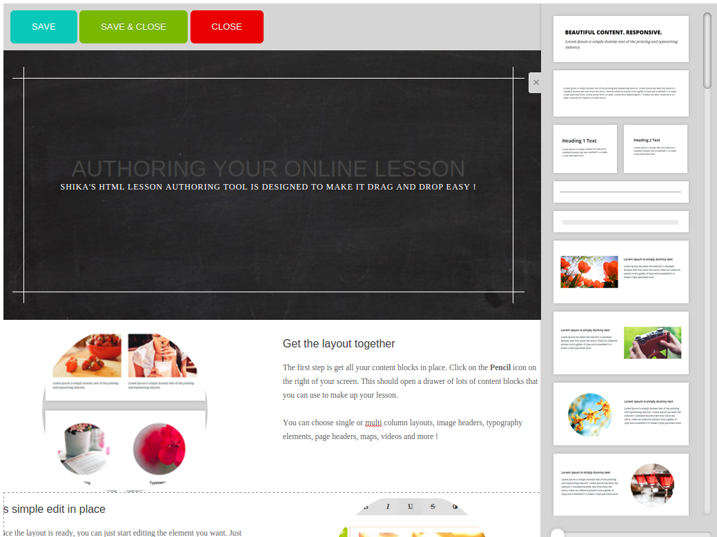 Initially, we had planned to go with the Plain old Joomla WYSIWYG editor for authoring HTML lessons. However, we have an awesome surprise for you. We are proud to introduce a brand new drag and drop HTML authoring tool in Shika.