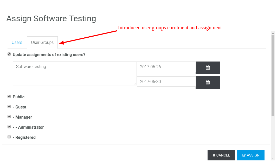 Now the assign function lets you assign a course to all users in a User group using the Assign by Group function.