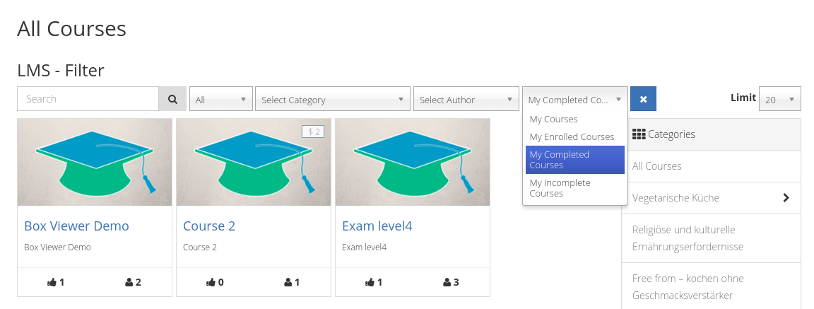 In this release, we have added a new filter named “Show course status” for LMS-Filter module for all courses. The users can now have a clear idea about the courses they have enrolled, the courses they have completed and the courses that are incomplete.