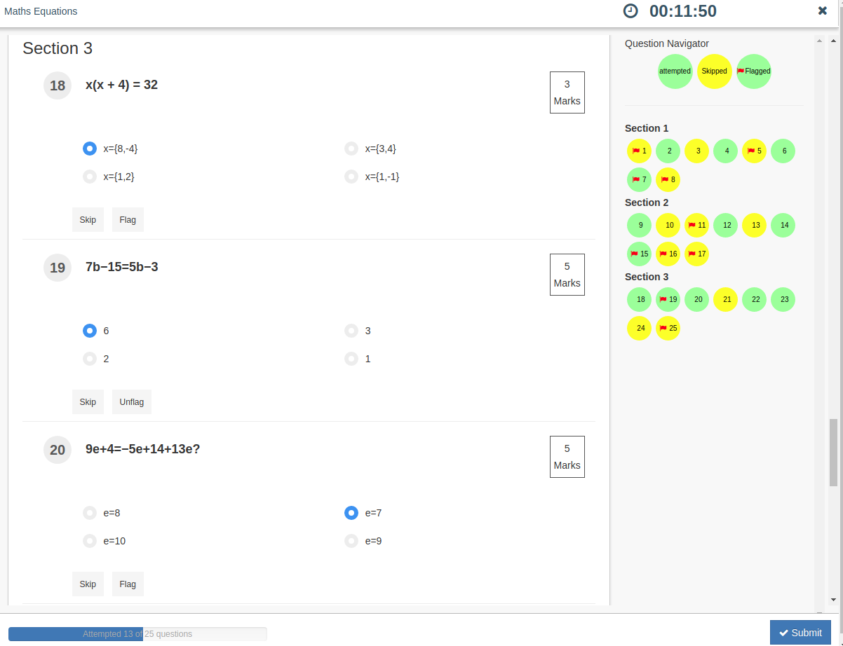 A Question navigator highlights gives a quick overview of the questions you have attempted, skipped and flagged and also allows you to jump to any question with a single click. This feature is extremely useful for competitive exams, Distance education and also In Lab exams where a large number of questions need to be answered.