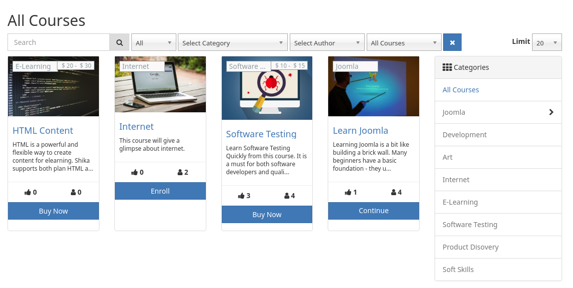 With Shika 1.3.30, we have introduced two brand new course layouts-Compact and Extended. We have also renamed the default layout as Legacy. The compact view is a perfect fit to view courses using mobile devices. The Extended Layout displays the image along with the course description.