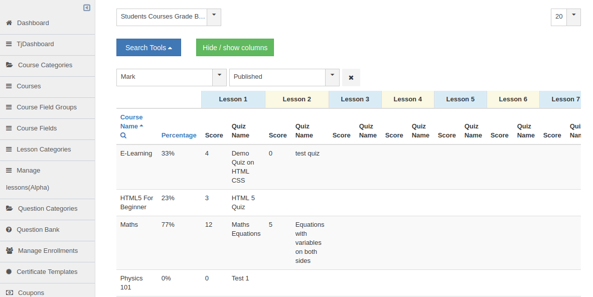 Using the course grade book report, site administrators can view the scores and percentage of the various users for the specific course.