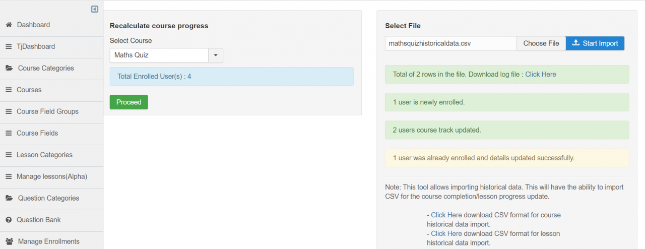 Over the years, we’ve had several customers move over to Shika from a variety of different LMS platforms. One of the most requested features has been the ability to bring in course completion data from other LMS’s. We already have import tools for various aspects like question banks, User enrollments etc. In this release, we bring the ability to import historical course completion data down to lesson level completions. Site administrators will simply have to create the respective courses & users and update the historical data of the user's course completion status and lesson progress using CSV import.