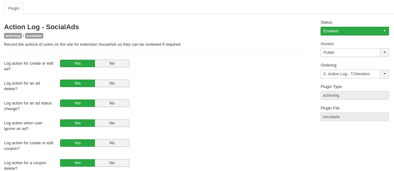 - Actionlog plugin for SocialAds enables site administrators to log actions for different activities integral to SocialAds like ads, orders, campaigns, coupons and zones.