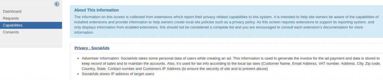 - This plugin will help site admins drafting their privacy policy by showing in the admin area what all user data SocialAds collects