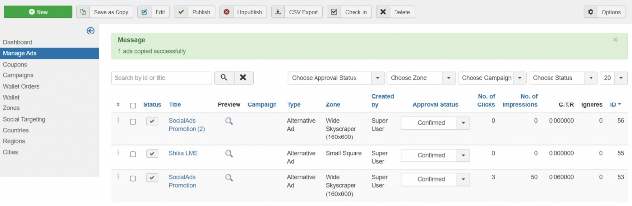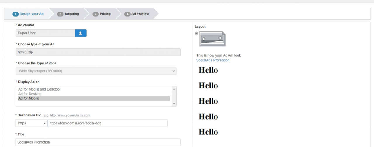 We are happy to release SocialAds 4.0.2 with the much awaited HTML5 Ads support. Besides this, one can easily create copies of existing ads from both frontend as well as backend. We have introduced an option to select the device on which Ad will be displayed (mobile OR desktop OR Both). A new configuration has been added to configure user groups who can create unlimited ads. Besides this, we have also fixed many bugs reported by our subscribers in this release.
