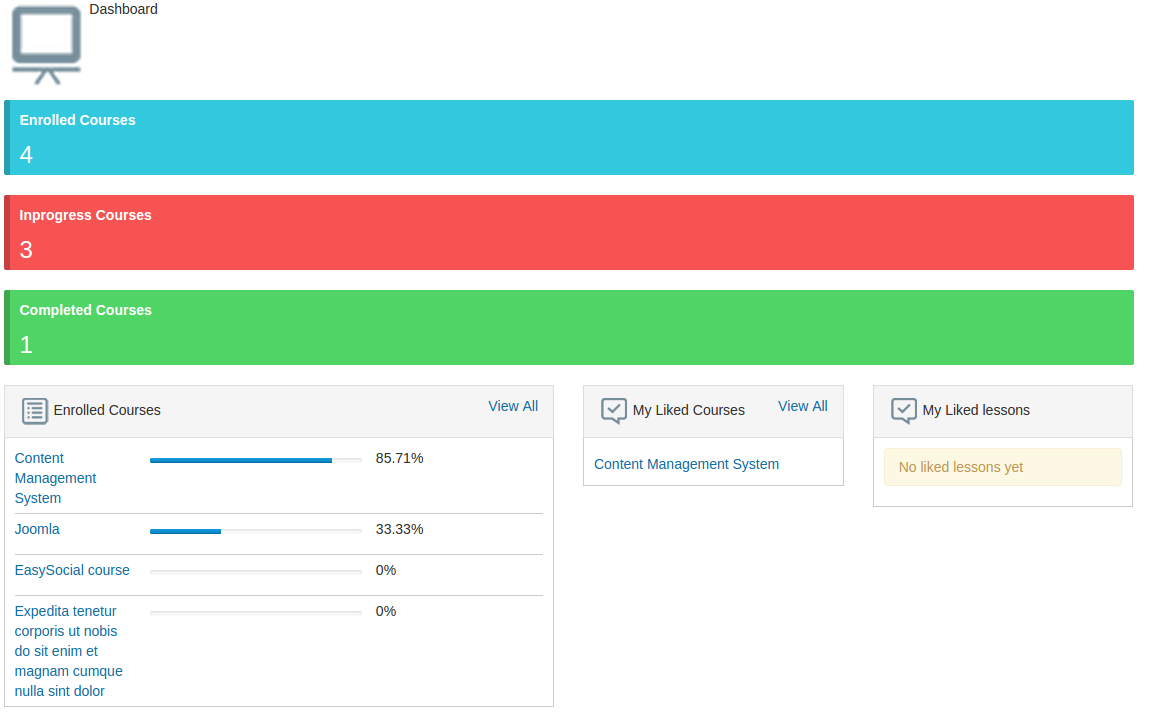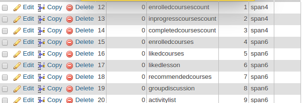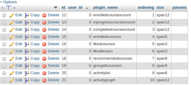 We have created a new table #__tjlms_dashboard which contains all the widgets per users. If the users has not set any widgets to be shown or is using the default dashboard, basic dashboard plugins will be shown.