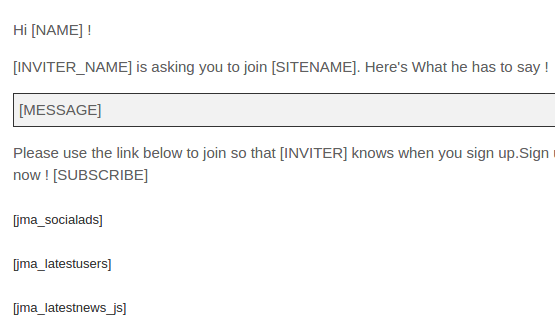 J!MailAlerts plugins are supported in Invitex allowing you to send rich, targeted content in your invitation emails. Latest Site users, Latest Photos of the Inviter, Latest site News. The list is pretty long as to what can be sent. Dynamic content that the Invitee can relate to is a sure shot way to make that conversion. If you use this intelligently like Facebook & LinkedIn do, you will see steady growth in conversions. These can also be used in Invitation reminders.