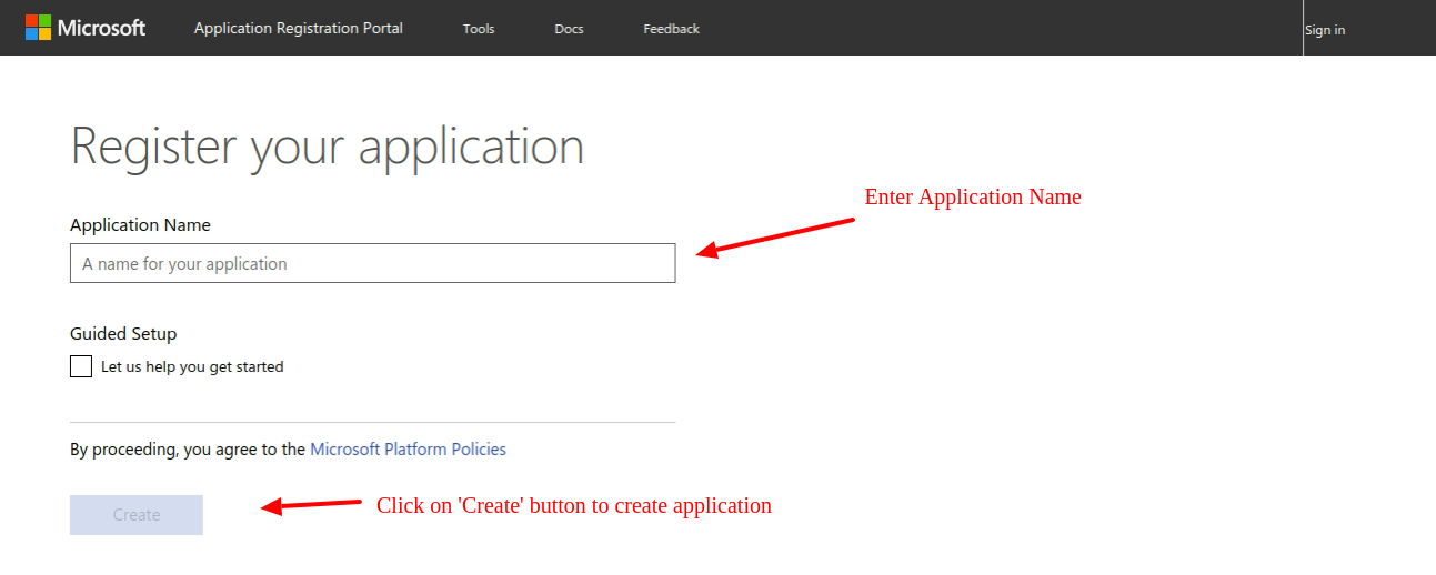 1. Go to https://apps.dev.microsoft.com/portal/register-app (Login if you are not logged in)
