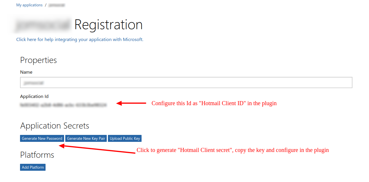 3. Ge the "Hotmail Client ID" and "Hotmail Client secret" and configure it in the plugin.