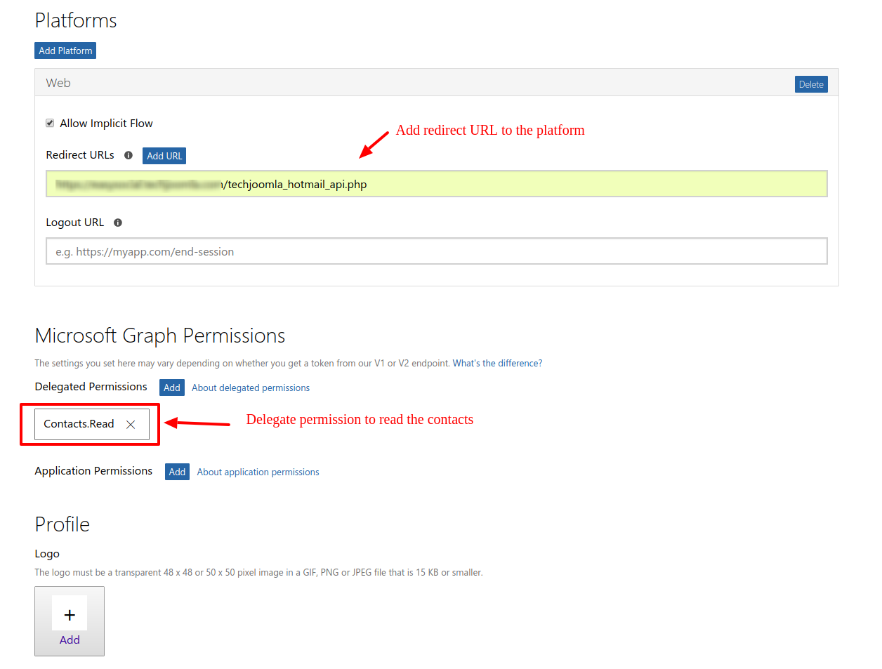 4. Add Platform and Delegated Permissions to the app.