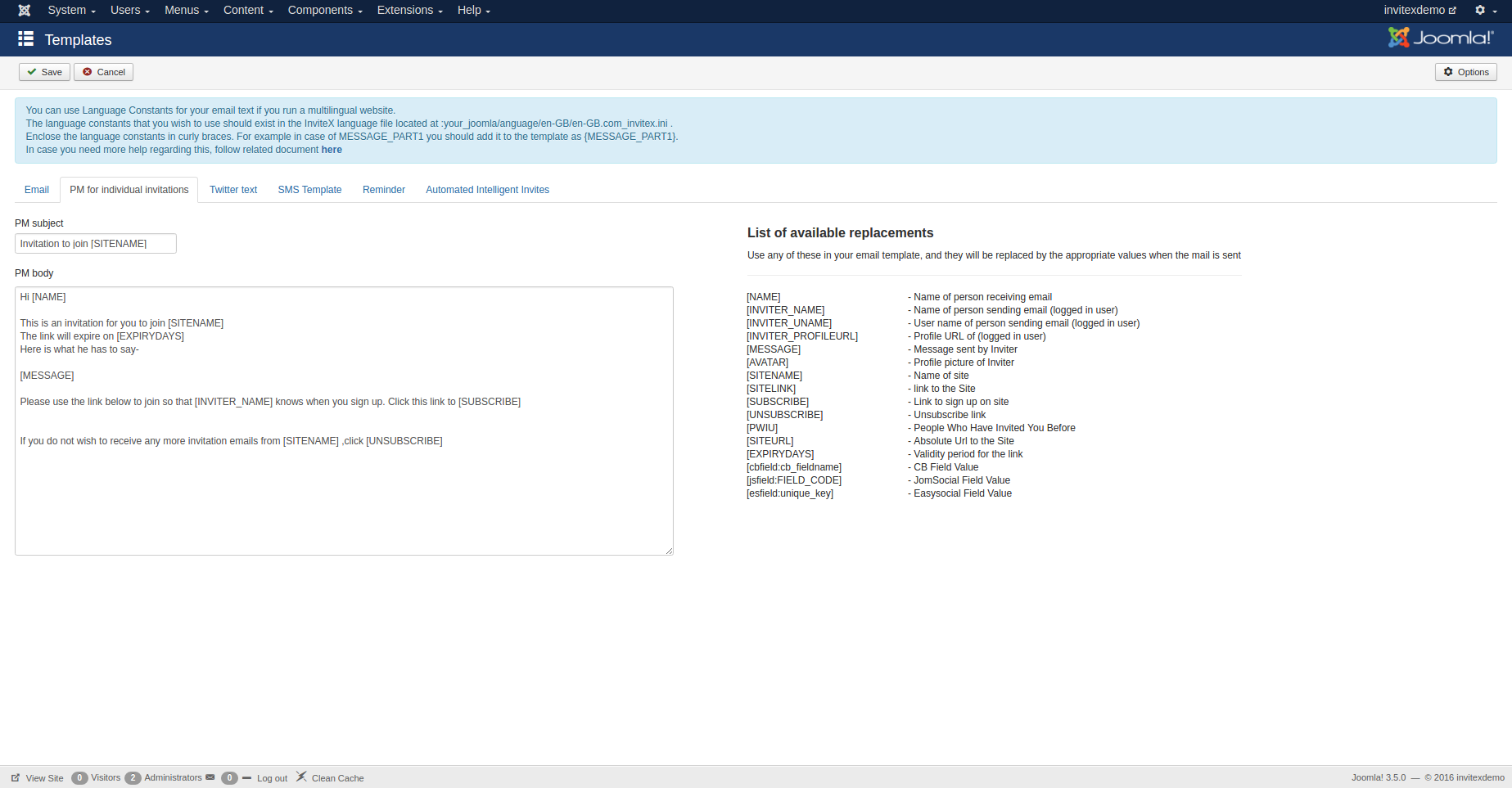 You can use replacement tags shown below in the screenshot to personalise your mail to add the Inviter's Name, Avatar etc. In the future many more tags shall also be supported.