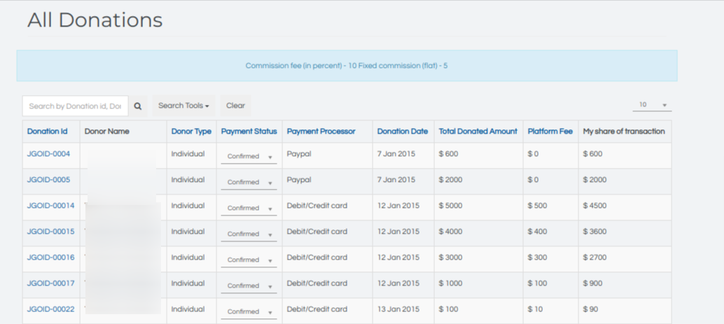 Donation Id: Donation ID, if you click on Donation id then donation details view will be open, where the promoter can view that particular donation details.