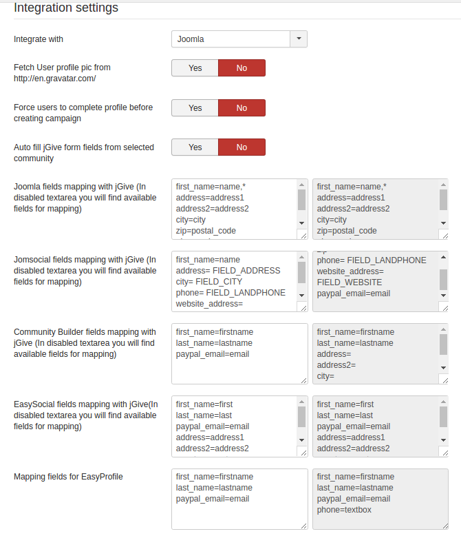 paypal_email=email - EasySocial fields mapping with jGive(In disabled textarea you will find available fields for mapping): This is needed for checking 'Profile competition' & for 'Auto filling form fields.