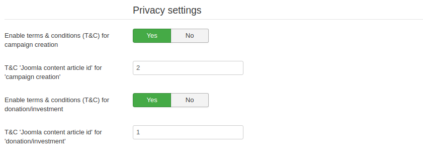 - T&C 'Joomla content article id' for 'Campaign creation': Enter 'Joomla content article id' for T&C for 'Campaign creation'. Enter 0 if you don't want to use T&C for 'Campaign Creation'.