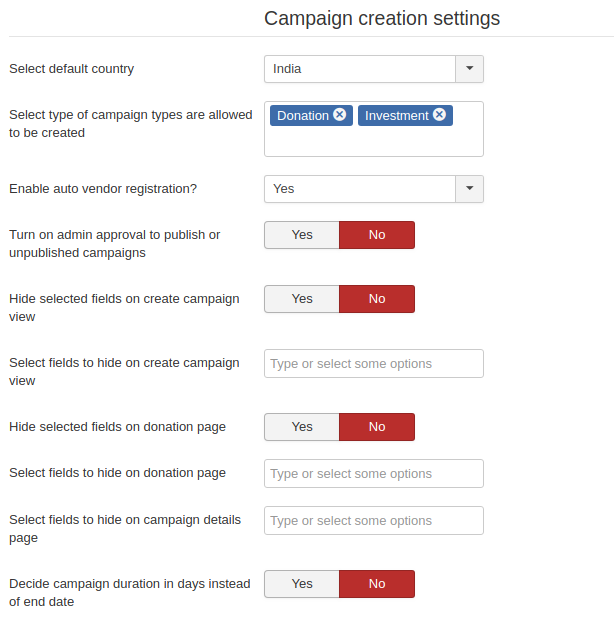 - Select default country: Select default country to be used on 'Create campaign form' and 'payment form'.
