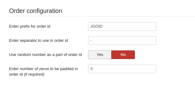 - Enter number of zeroes to be padded in order id (if required) - Set the number of zeroes to be used in order id generation if needed. Final order id may look like this - JGOID-XYG5F-000123