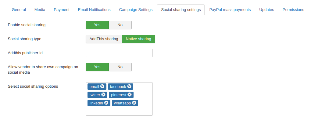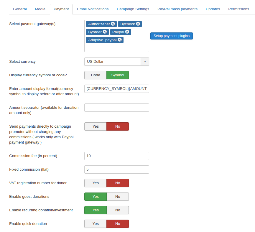 - Commission fee (in percent) - Enter commission fee to be charged per transaction(in %). Commission set will be charged if only Send payments directly to campaign promoter without charging any commissions ( works only with Paypal payment gateway ) is set 'Yes'.