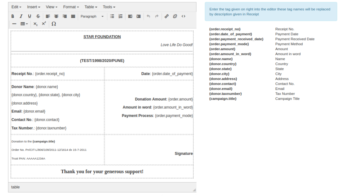 Now we have filled a sample data. Site admin should update before giving a certificate to any contributor/donors.