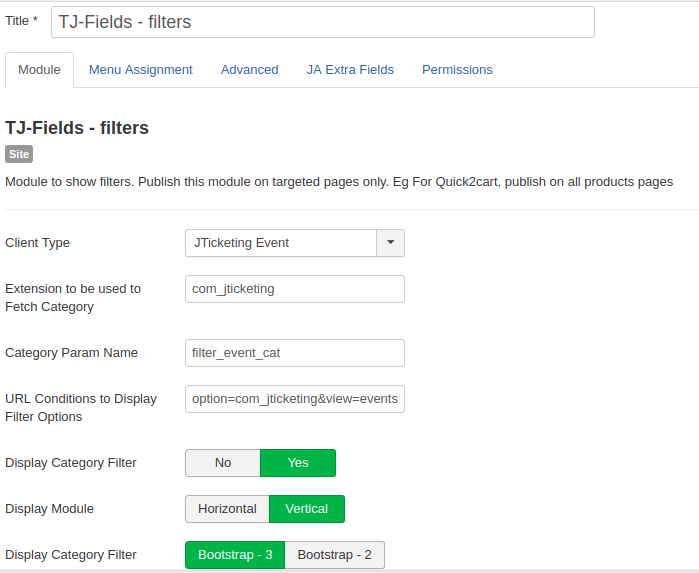 Display Category Filter: default is Bootstrap3. This is a common module for 'JGive, JTicketing, Quick2cart'. For JTicketing set bootstrap3.