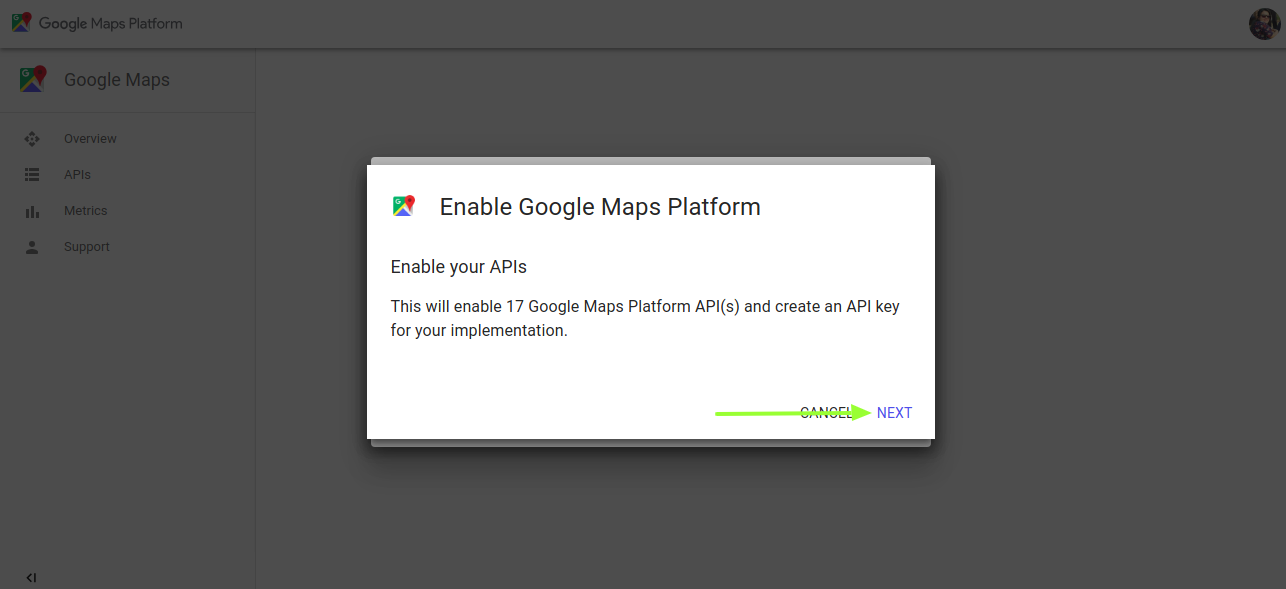 - In the pop-up window, you will be provided an option to enable your APIs. Press Next.