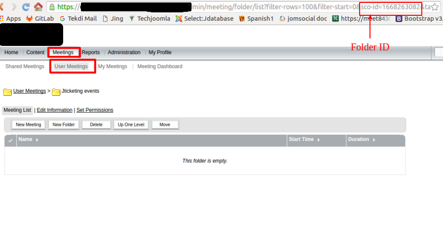 - Folder ID to store events - On Adobe Connect, every folder and meeting/seminar have unique ID's called as SCO-ID. It is present in the URL of Adobe Connect. To store the events in the specific folder we need folder ID (sco-id) of that folder. To get the sco-id, login to your Adobe Connect account. Go to the User meeting/seminar menu. Click on the existing folder named as your adobe connect username. Check the browser URL. You will find the sco-id.