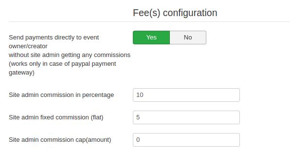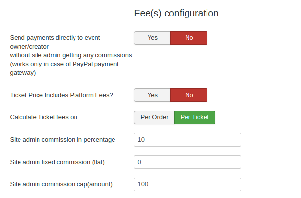Buyer buys 2 tickets and pay $22 (Total = $20 fee(10%) = $2) : In this case $ 20 will be transferred to vendor and $2 will be transferred to admin.
