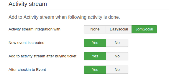 8) Activity stream configuration: Enable the activity stream integration by setting it to Jomsocial. This will trigger the activities when an event is created or when a ticket is bought or when check-in to the event is done.