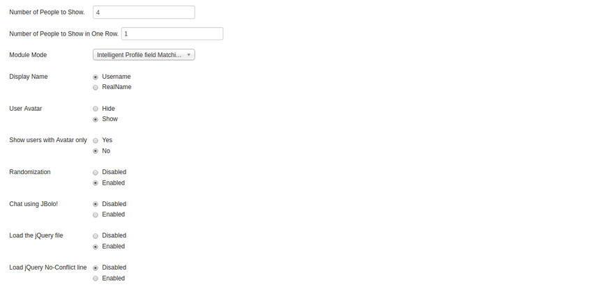 Open the People Suggest Module from the Joomla Module manager. You will find the Basic Options panel. These parameters will help you to control the display of the suggestions in the front end. These are the options available in the select box. If you select The next Profile field Matching parameters for Jomsocial panel has parameters to configure the Profile field Matching for JomSocial Profile field Matching parameters for Community Builder panel has parameters to configure the Profile field Matching for CB Profile field Matching parameters for Easysocial panel has parameters to configure the Profile field Matching for Easysocial Component Setup and Configuration
